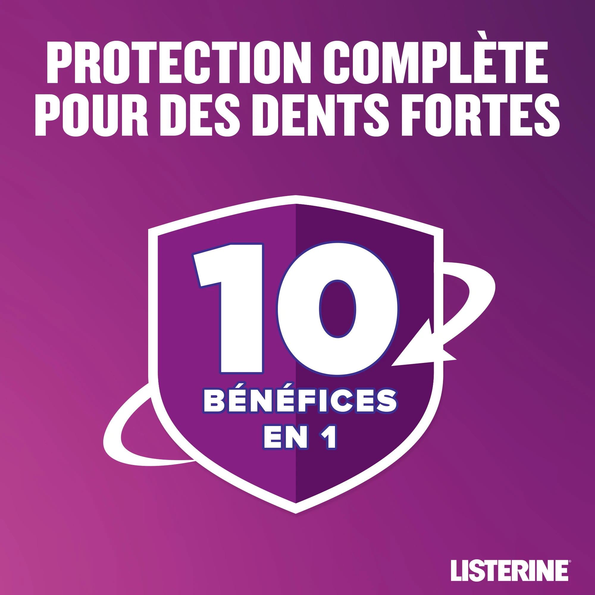 C'est prouvé, utilisé deux fois par jour, LISTERINE® Total Care Goût Plus Léger est un bain de bouche SANS ALCOOL qui nettoie et protège avec 10 bénéfices pour une hygiène bucco-dentaire totale :